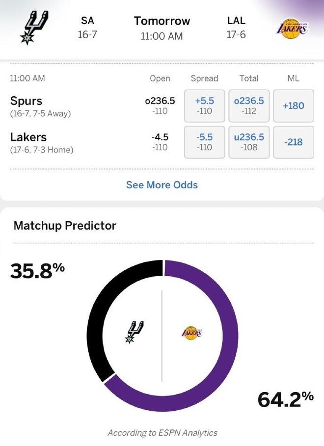 双方本赛季有过一次交锋,湖人当时主场118-116险胜马刺,两队将争夺一个NBA杯四强的名额。ESPN给出获胜概率:湖人64.2%、马刺35.8%。